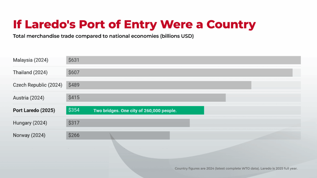 With $353.9 billion in annual trade, the Laredo Port of Entry would rank around #31 in global trade, comparable to countries like Austria or Hungary.