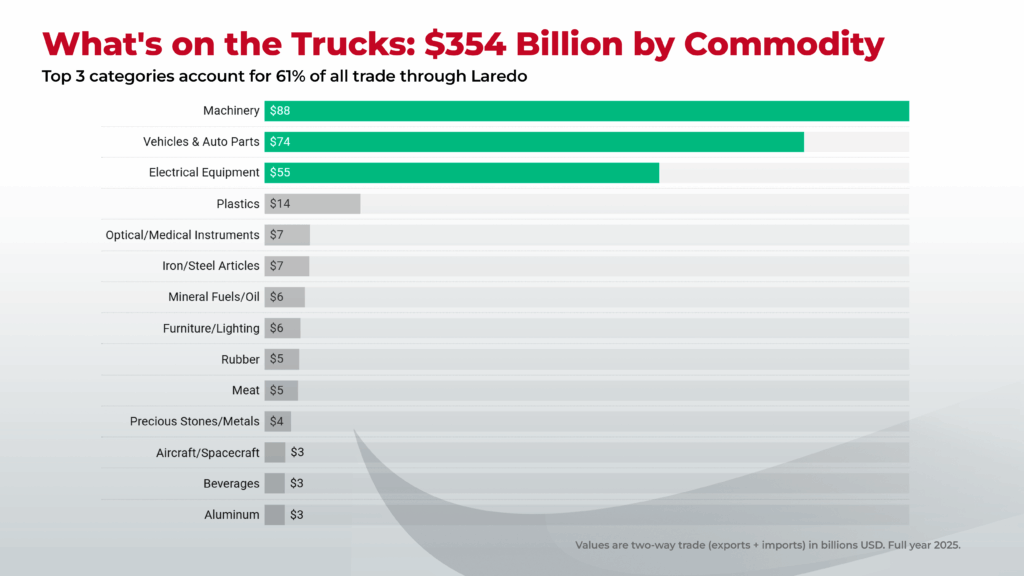 According to analysis by Daniel Covarrubias in his latest article in The Bridge, nearly $872.8 billion in U.S.-Mexico trade in 2025 is concentrated: