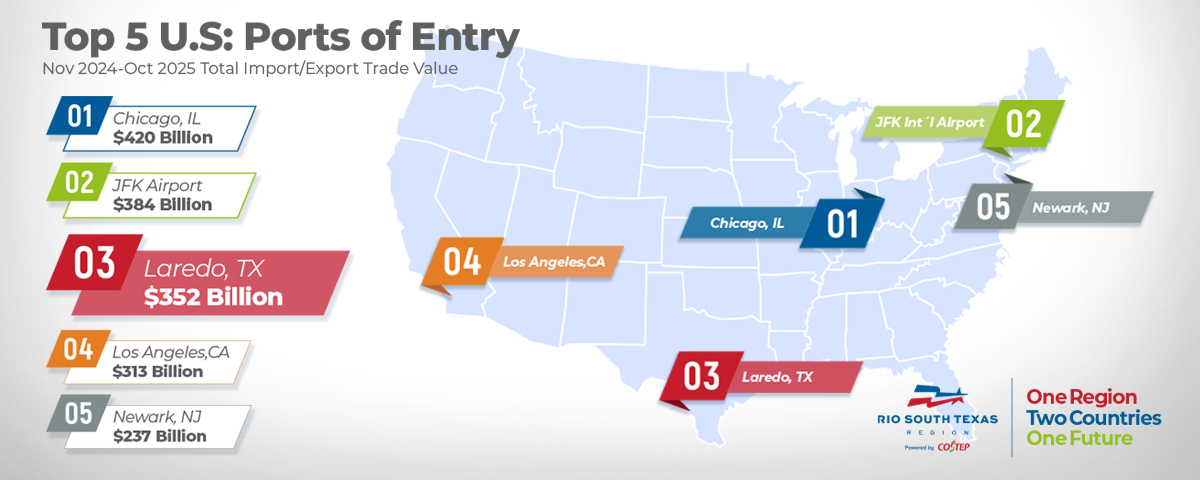 February 2, 2026Port Laredo has consolidated its position as the third most important Port of Entry in the United States, while remaining #1 in land-based trade and #1 in USMCA commerce.